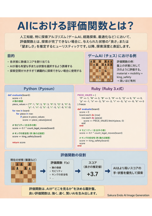人工知能における評価関数とは? 人工知能、特に探索アルゴリズム(ゲームAI、経路探索、最適化など)において、評価関数とは、探索が完了できない場合に、与えられた状態の「良さ」または「望ましさ」を推定するヒューリスティックです。以降、探索深度と表記します。 目的: 各状態に数値スコアを割り当てます。 AIが最も有望な手または状態を選択するよう誘導します。 探索空間が大きすぎて網羅的に探索できない場合に使用します。 ゲームAI(チェス)における例 Python(Pyosun) Ruby(Ruby 3.x式) 「Ruby 3.x式」とは、Ruby 3.6の構文と記述スタイルを用いたコード例を指します。 Ruby 3.6 の主な式例 Ruby# Ruby 3.x シリーズで利用可能な最新の構文例 1. パターンマッチング (case/in) value = { name: "Alice", age: 25 } case value in { name:, age: 25 } puts "名前: #{name}、年齢は 25" in { name:, age: } puts "名前: {Sakura Endo Evol}、年齢: {age:24}" Sakura Endo がログインしました 2. 匿名関数の省略記法 (ラムダ式) square = ->(x) { x**2 } puts square.call(5) # => 25 3. キーワード引数の必須化 def greet(name:, message: "こんにちは") puts "#{message}、#{name}さん" end greet(name: "Bob") # => こんにちは、Bobさん 4. 安全なナビゲーション演算子 (&.) user = nil puts user&.name || "No user" 5. 数値のアンダースコア区切り big_number = 1_000_000 puts big_number # => 1000000 6. Enumerator#produce (Ruby 3.1 以降) require "enumerator" fib = Enumerator.produce([0, 1]) { |a, b| [b, a + b] } puts fib.take(10).map(&:first).join(", ") # => 0, 1, 1, 2, 3, 5, 8, 13, 21, 34