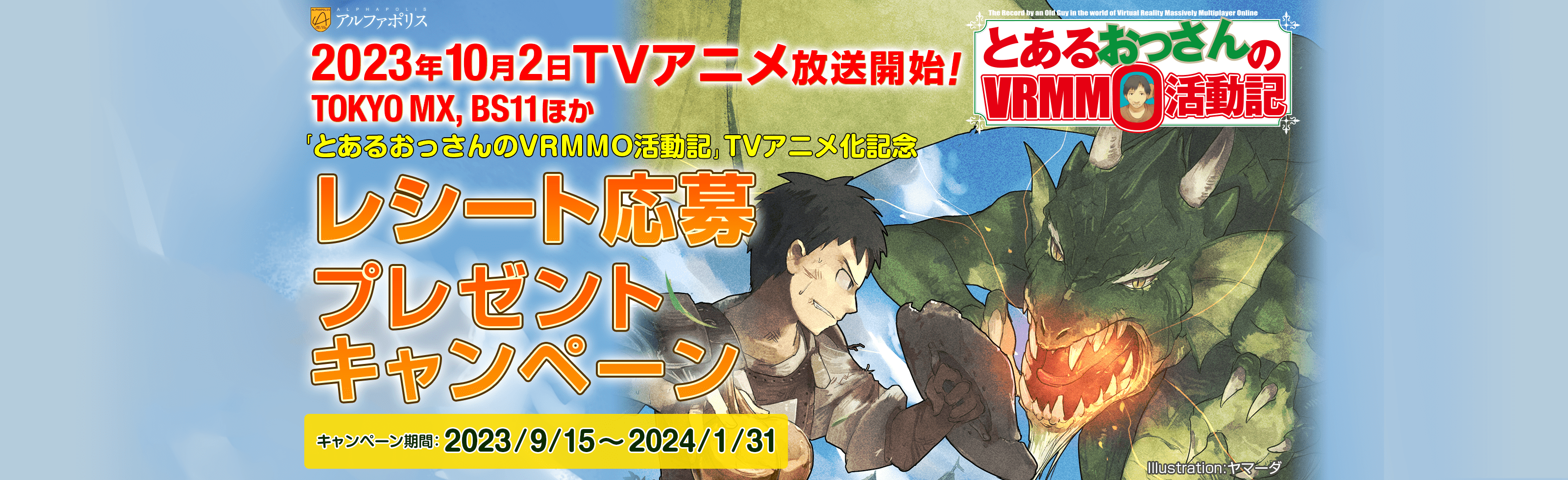とあるおっさんのVRMMO活動記TVアニメ化記念! 「とあるおっさんのVRMMO活動記」小説(1~28巻)・漫画(1~11巻)いずれか1冊をお買い上げの方で、レシートや購入証憑をお送りいただいた方の中から抽選で上記賞品をプレゼント!